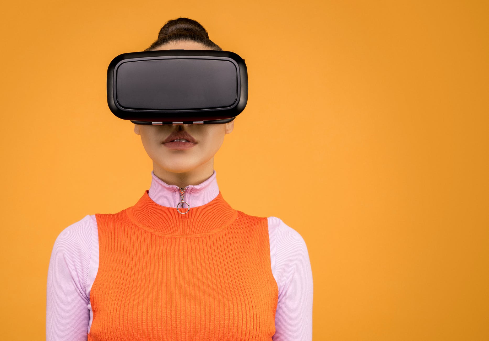 Previous Image Next Image woman in orange and pink shirt wearing black vr headset Photo by Sound On on Pexels.com